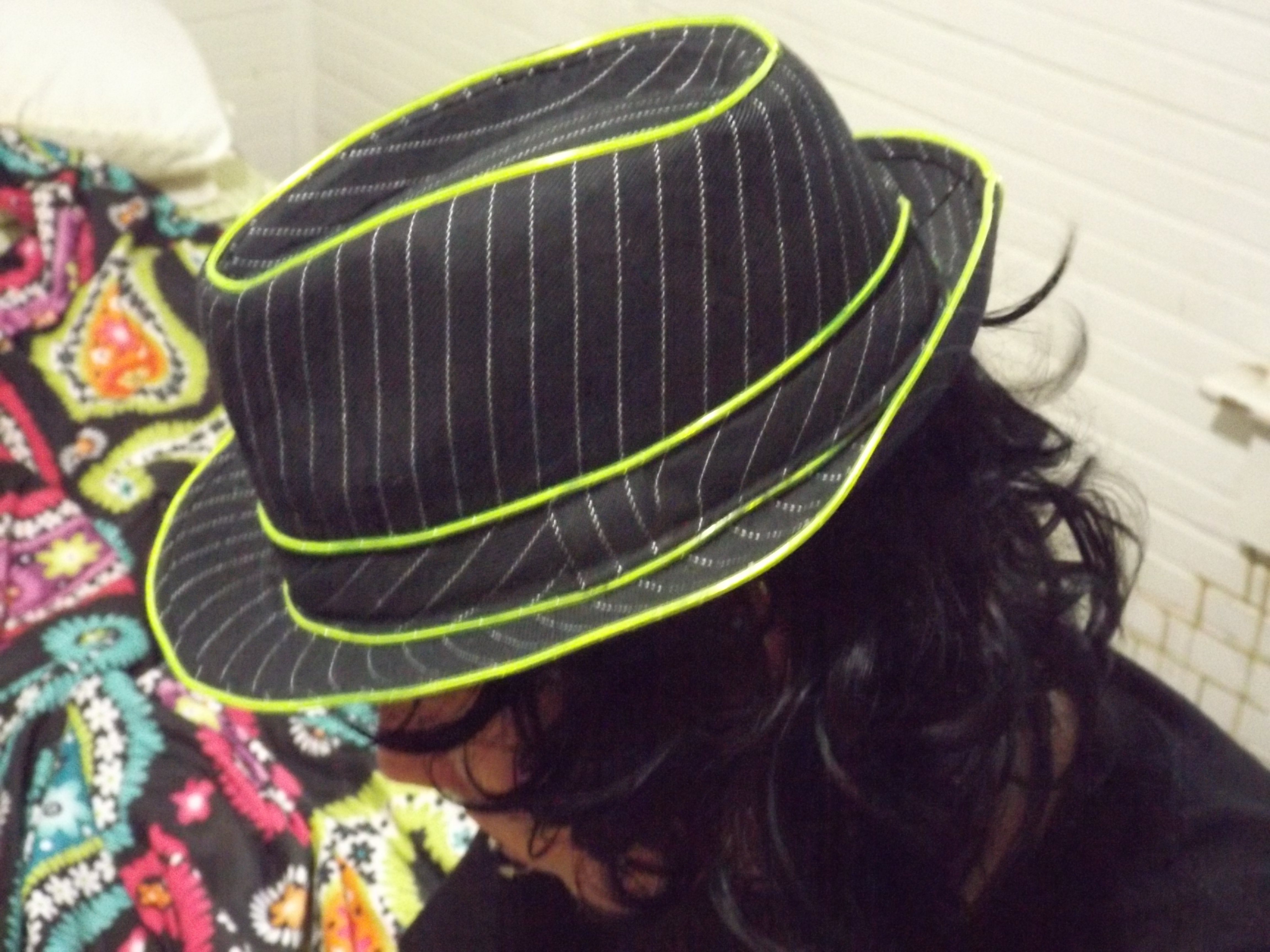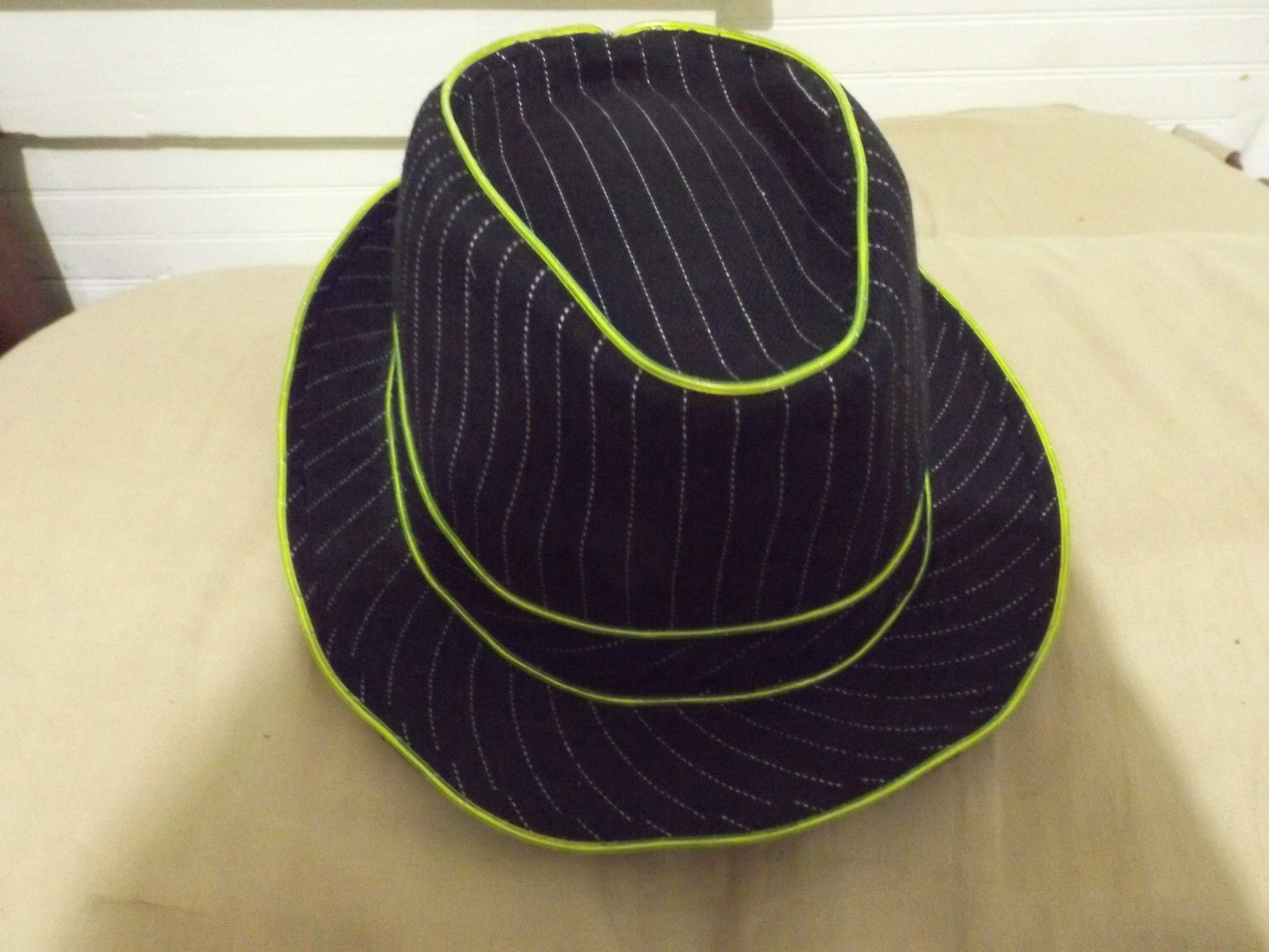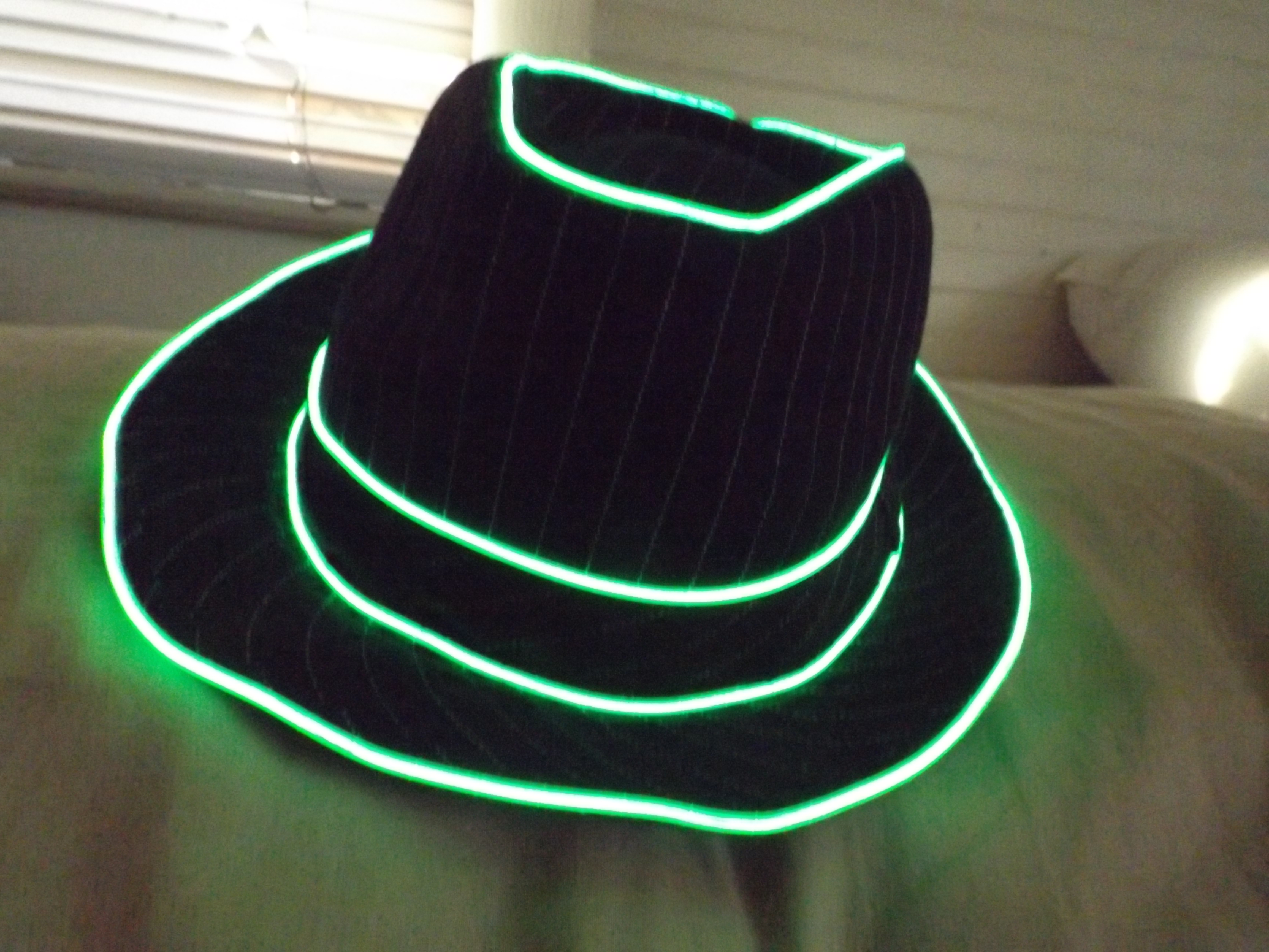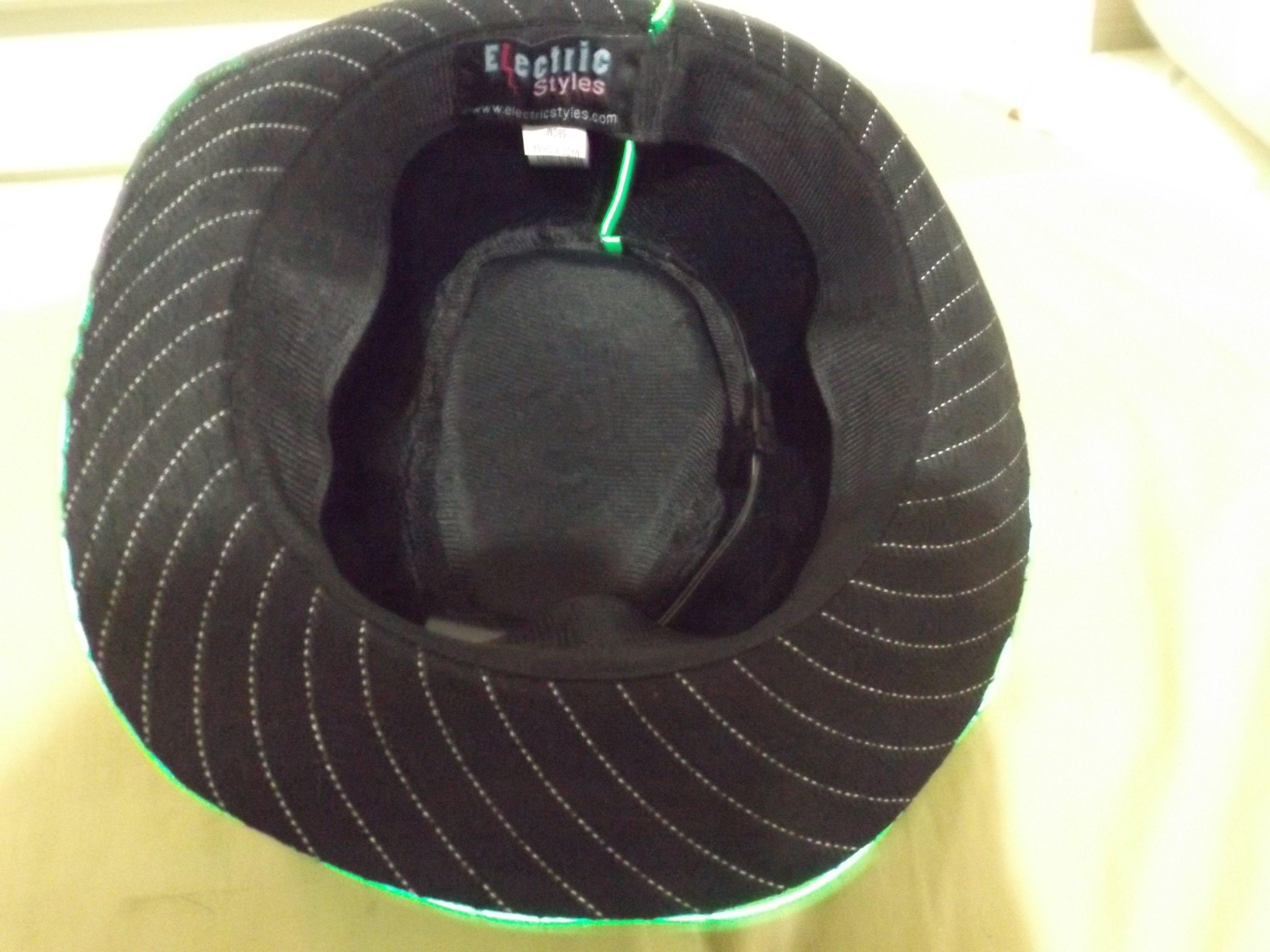 The fedora is made out of a sturdy fabric that can stand up to a beating from a hard night of partying. The fedora is black with white pin striping with green piping. Although this isn’t a fedora you can pick up anywhere, this one lights up! The lighting does come in assorted colors although the one I reviewed is green. The power supply hooks into the front. You won’t have any discomfort from the power pack it fits snugly in the hat.