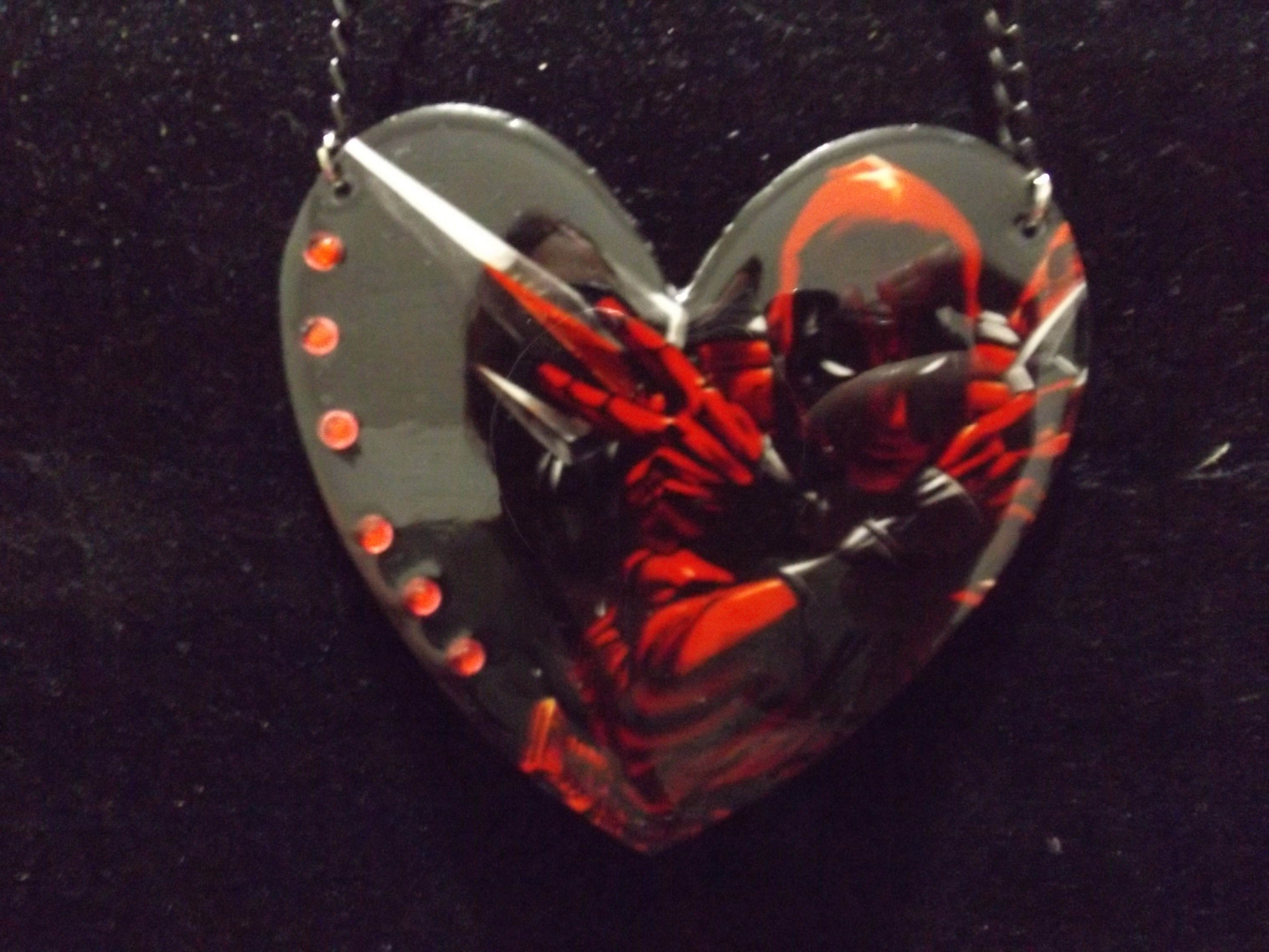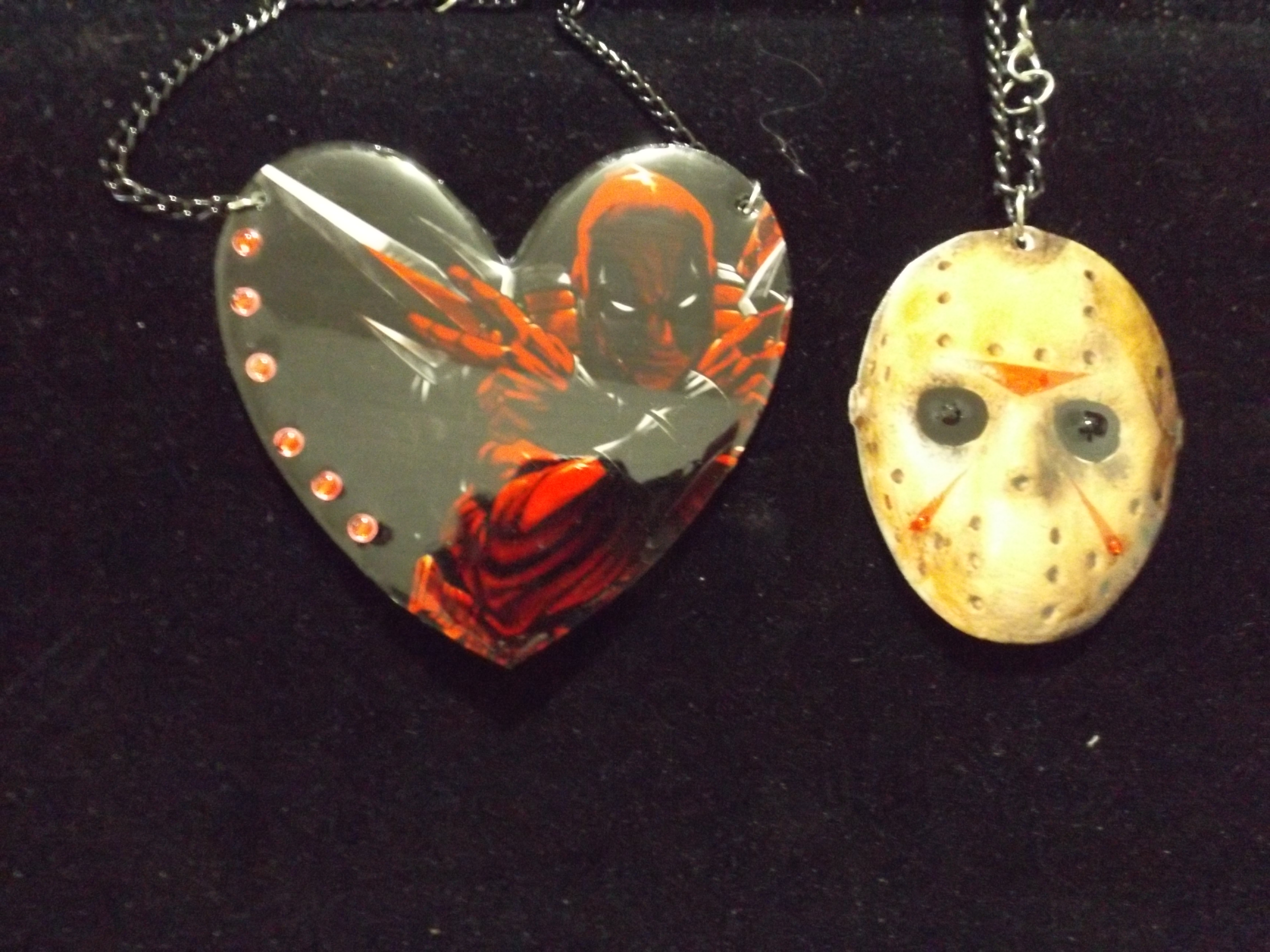 Both necklaces are very pretty. I know your thinking how can they be pretty? Well I will tell you how they are both are adorned with rhinestones. The Jason necklace is his hockey mask with jeweled eyes and Deadpool is in the shape of a heart with jewels running down the one side.