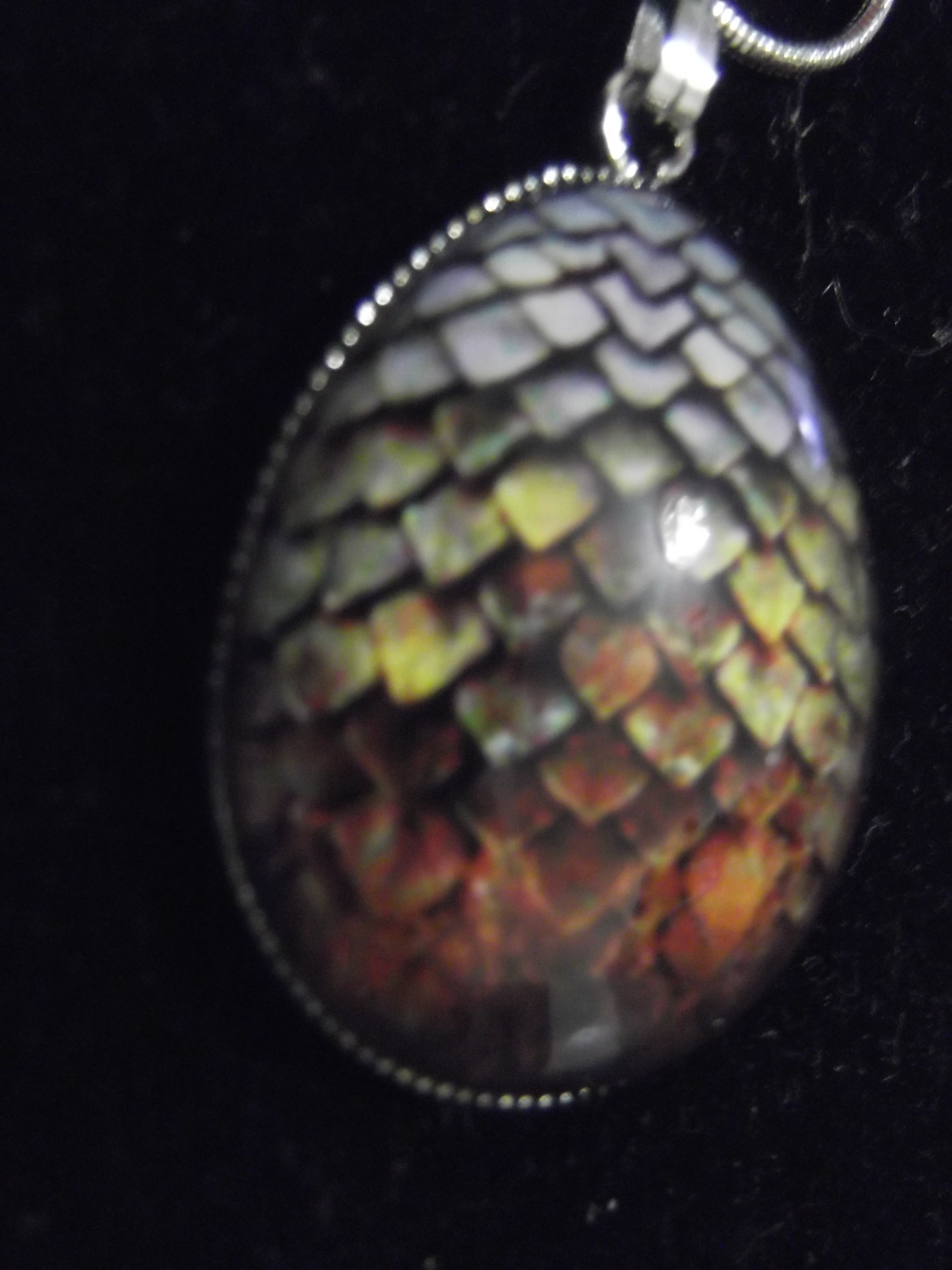 As you can see it’s also not a flat pendent it’s actually domed so its got a great shape. It really gives it the dragon egg effect. It also comes in several color options depending on what you are looking for. I love the jeweled tones that shine through this pendent. Even though it’s a brown egg as you can see there is also gold tones.