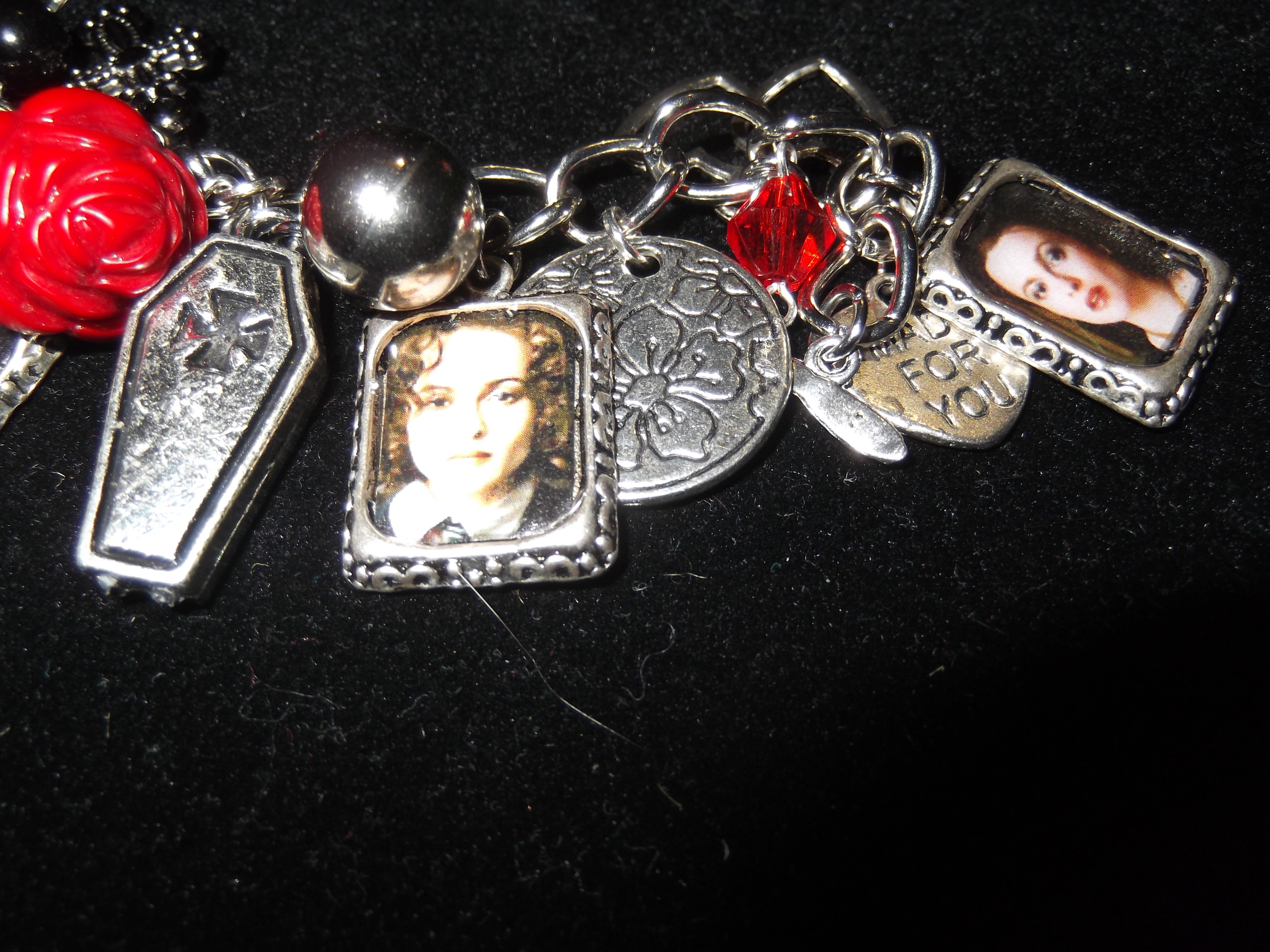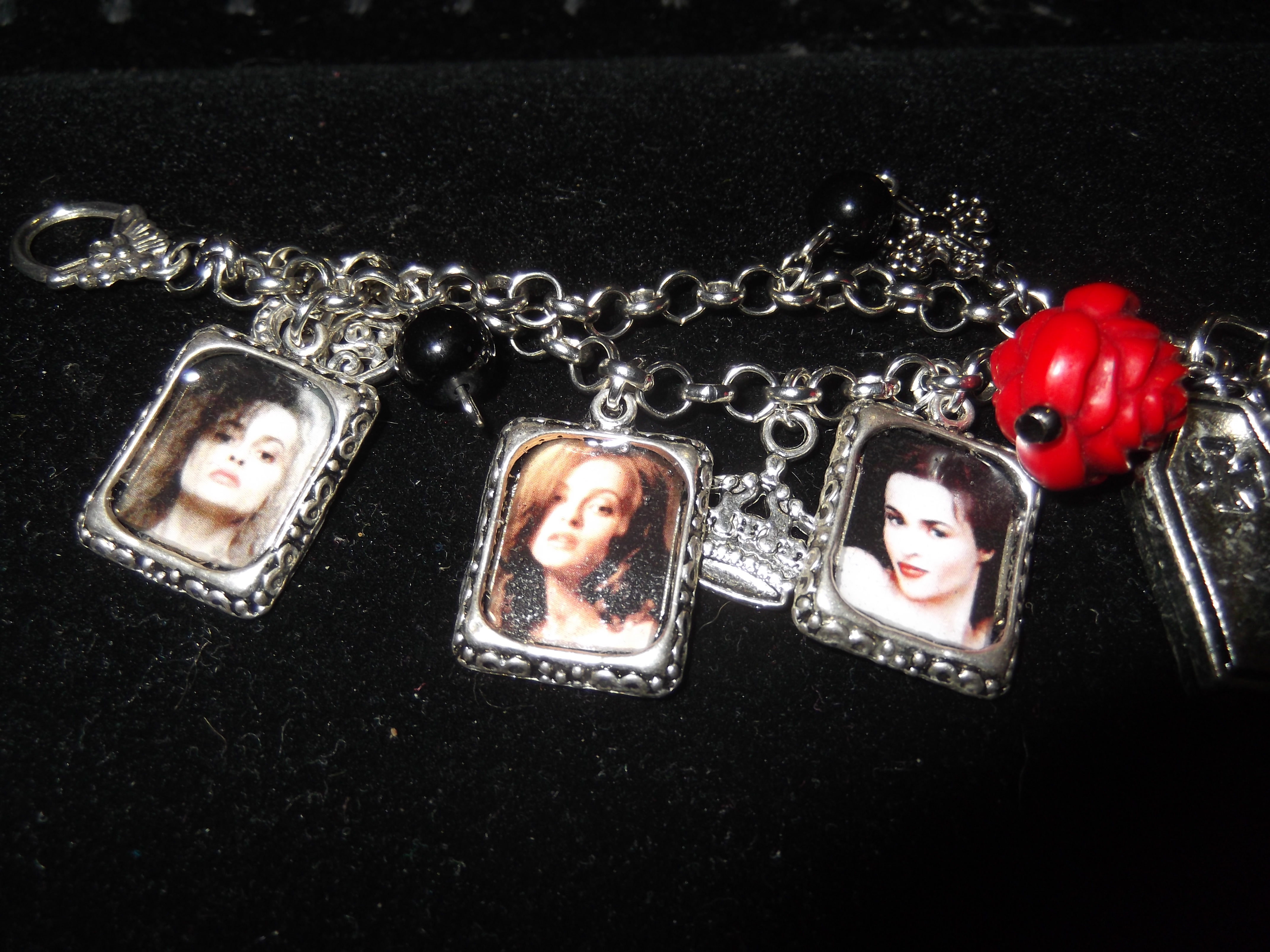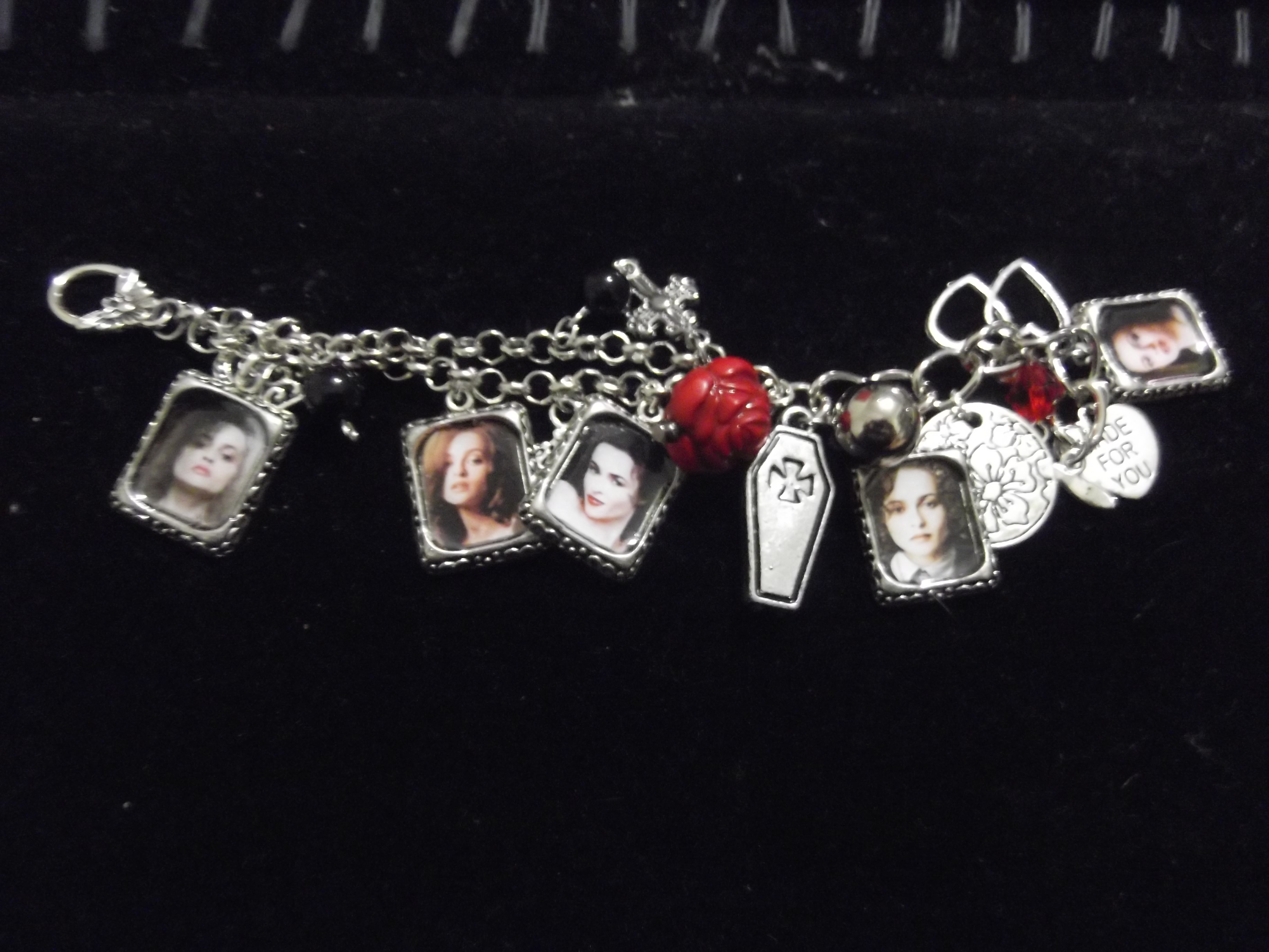 As you can see this charm bracelet has several photos of Helena from different characters she has played. There is also other charms to go with each character. One thing I should mention about this bracelet if you have a larger wrist it might not fit you; this was an issue I had! However that doesn’t mean this bracelet is lost to you!! There is a section that is a double section of the the chain; which means if you can adjust the sizing some with very little change to the bracelet. I only had to adjust it slightly. Which brings me back to how awesome this bracelet is. It looks great and its a fun piece to own!