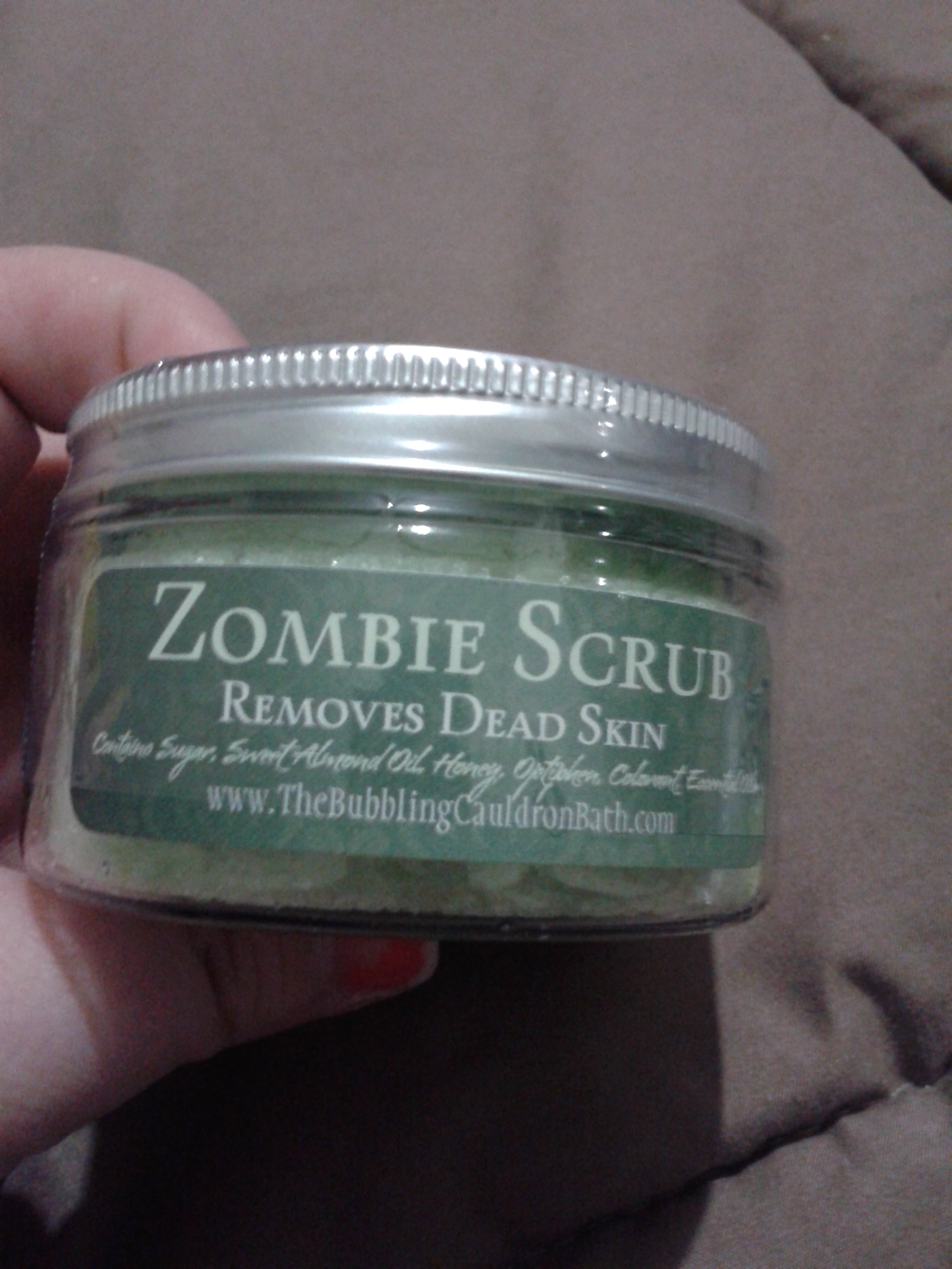 Inside that beautiful little package was an 4 oz. jar of Zombie Scrub. This scrub is a sugar scrub not a salt scrub. It makes your skin feel wonderful and just glow. It also smells wonderful. I just love the way it smells. I also love that the ingredients are all natural. The only thing in this scrub is pure sugar cane, sweet almond oil, honey, and a pinch of hemlock; is the base ingredients for this scrub. It fragrances are eucalyptus oil and distilled swamp water.