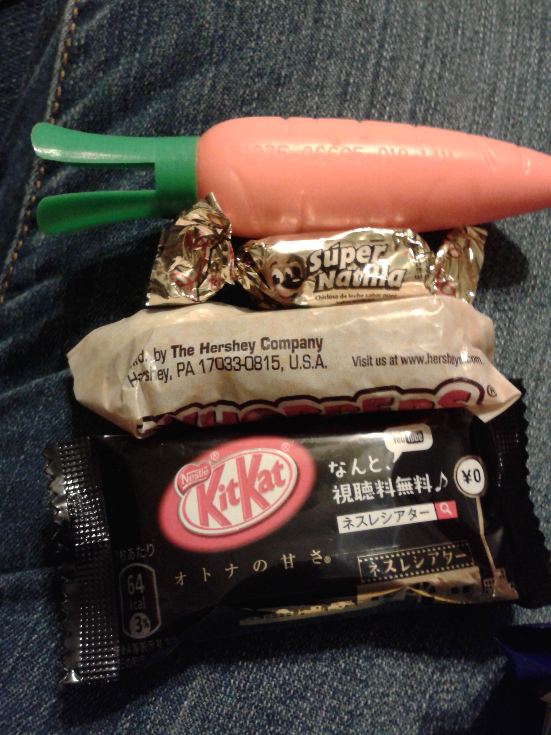 The blue Kit-Kat is just wrong and nasty!! Its a white chocolate grape Kit-Kat!! There are so many things wrong with this. In the second picture there is a Kit-Kat in a black wrapper that is a coffee flavored Kit-Kat. That one isn’t bad. There was also Whoppers and that candy in the gold wrapper is a caramel.
