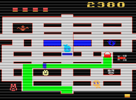 A third character, appearing to be an animal, rolling tire, or invisible man depending on the level, may enter the maze and leave tracks that must be painted over in order for the board to be completed. The player can limit the damage by running over the figure, which not only stops further tracks from being left but also awards the player a score, which progressively increases as more boards are cleared.